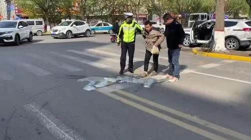 5月11日早上7點42分,肇東交警大隊城鎮(zhèn)三中隊中隊長牛玉強帶領(lǐng)輔警王鑫巡邏至西湖小區(qū)路口東20米處附近時,發(fā)現(xiàn)一騎摩托車男子突然意外摔倒,車上早餐散落一地,見此情況,執(zhí)勤人員立即上前詢問男子有沒有受傷,得知男子只是腰部擦傷,并無大" />