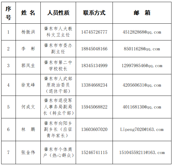 為維護(hù)廣大應(yīng)征青年的合法權(quán)益,進(jìn)一步增強(qiáng)全市征兵工作的透明度,確保征兵工作公開、公平、公正。現(xiàn)將廉潔征兵監(jiān)督員名單予以公示,歡迎社會(huì)各界對(duì)違反廉潔征兵紀(jì)律的行為給予監(jiān)督舉報(bào)。