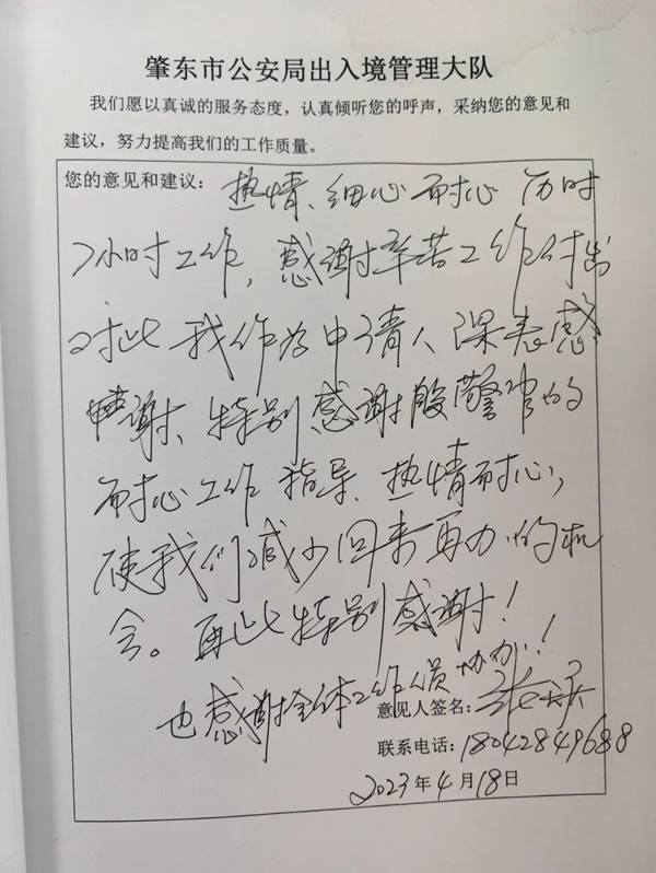 4月18日,從香港返鄉(xiāng)的肇東籍居民張先生攜妻子陳女士來(lái)到肇東市公安局出入境接待大廳,妻子陳女士是香港人,兩人此次是專程飛回來(lái)辦理張先生赴香港定居手續(xù),為了不耽誤二人的返程時(shí)間,辦證民警加班加點(diǎn)忙碌兩個(gè)多小時(shí)為張先生辦理通過(guò)所需辦證材料,張先生感動(dòng)不已,連連說(shuō):“家鄉(xiāng)人太好了,你們出入境民警太暖心了!”當(dāng)即寫下一封感謝信表達(dá)心情。