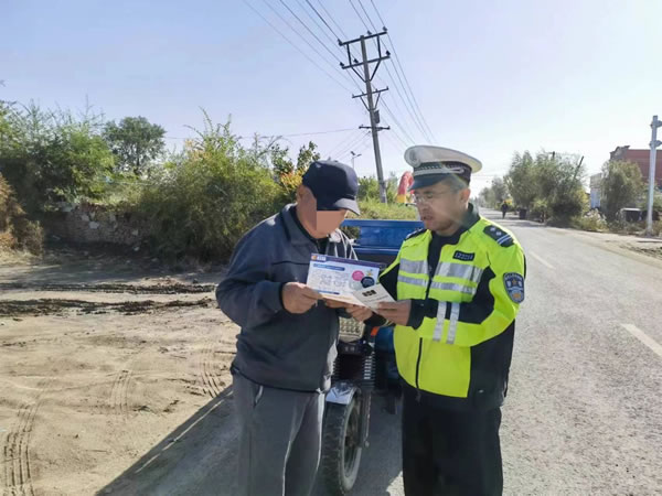 活動過程中,民警首先走進各鄉(xiāng)鎮(zhèn)村委會,與村干部深入溝通,了解各村具體情況。然后,大隊民輔警以忘我精神和高度負責的工作態(tài)度,走進各村屯,對過往車輛進行交通安全宣傳工作,為群眾發(fā)放《秋收道路交通安全須知》、《一盔一帶》、《遠離酒駕、平安出行》等宣傳資料,面對面宣講法律法規(guī)和交通安全常識,解釋農(nóng)民朋友提出的疑問,解答他們關(guān)心的交通問題。并對農(nóng)村秋收使用的四輪車、農(nóng)用機械等反光標識缺失、失效的車輛,當場免費為其粘貼。