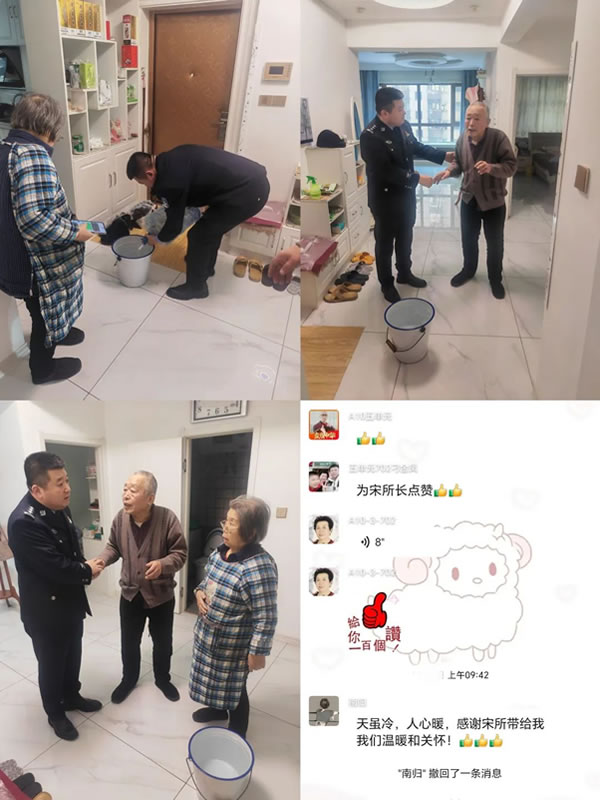 五一假期這天,萬福國際小區(qū)因線路問題,突然停水,A棟3單元的兩位老人剛要做飯,卻發(fā)現(xiàn)停水了,由于年紀大了下樓打水不方便,于是便在網格群里說了一句家里沒有水做不了飯。這一訴求被同在群內的奮斗派出所所長宋艷冬看在眼里,于是不到十分鐘便親自把生活用水送到了兩位老人家中,兩位老人激動地拉著宋所長的手,眼里飽含淚光和感激!