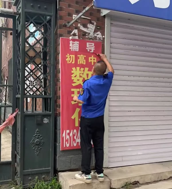 在檢查中,檢查組發(fā)現(xiàn)一家機(jī)構(gòu)墻板有學(xué)科類字樣,當(dāng)即下發(fā)限期整改通知書,要求立行立改;同時,對2家懸掛違規(guī)牌匾的機(jī)構(gòu),綜合執(zhí)法局工作人員予以了當(dāng)即拆除。