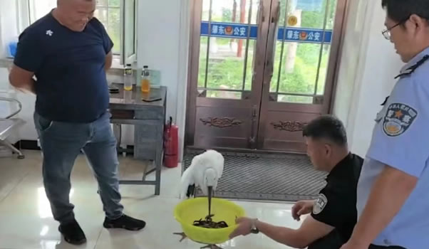 8月28日,躍進鄉(xiāng)福龍村書記宋健來到肇東市公安局躍進派出所,稱在躍進鄉(xiāng)福龍村新發(fā)屯草甸子上發(fā)現(xiàn)一只大鳥晃晃蕩蕩落在草甸子上,不斷哀鳴。大鳥體長120厘米左右,身上大部分呈白色,翅膀下方呈黑色,嘴部呈黑色,嘴的基部較厚,往尖端逐漸變細,并且略微向上翹,前頸的下部有呈披針形的長羽,腿部較長。但他一下子想不起來鳥的名字,只是知道它應該是保護動物,因此請求派出所進行救助。宋健介紹不知為什么,發(fā)現(xiàn)時這只大鳥不飛、不動,行動遲緩,也不曾進食,走上前也不怕,站在原地,他趕緊將它抱到派出所。民警看到大鳥后宛如“仙鶴”下凡,優(yōu)美的體態(tài),潔白的羽毛,朱紅色的眼眶,寬而長的翅膀,一看就是不尋常的鳥,民警擔心它有傷或是生病了,立即聯(lián)系肇東市林業(yè)部門,尋求專業(yè)的指導;經(jīng)專家仔細辨認,這只鳥類并不是“仙鶴”,而是被譽為“鳥中大熊貓”的東方白鸛,是國家一級保護動物。經(jīng)初步檢查,其外表沒有明顯傷痕,右側翅膀受點輕傷耷拉下來,但整體狀態(tài)較為虛弱,民警在派出所設置臨時保護區(qū)域,確保動物的安全,避免其受到二次傷害,民警拿來小魚和水進行投喂,白鸛簡單吃了幾只小魚。隨后民警對村書記的救助行為表示感謝。