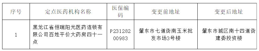 根據(jù)《國家醫(yī)療保障局令(第2號)》《國家醫(yī)療保障局令(第3號)》《綏化市醫(yī)療保障定點醫(yī)療機(jī)構(gòu)服務(wù)協(xié)議》《綏化市醫(yī)療保障定點零售藥店服務(wù)協(xié)議》《綏化市基本醫(yī)療保險定點醫(yī)療機(jī)構(gòu)定點零售藥店管理辦法》的相關(guān)規(guī)定,現(xiàn)對變更定點零售藥店地址公" />
