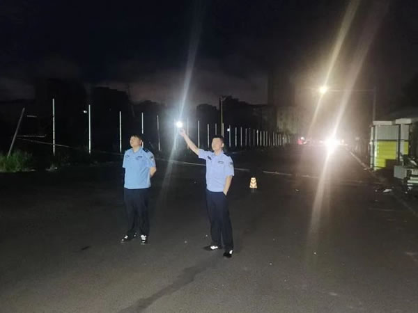 由于該路段照明設施少,電線桿倒伏位置特殊,現(xiàn)場十分危險,為防止車輛看不見電線而發(fā)生交通事故,在維修人員未到達現(xiàn)場之前,兩名民警分工明確,一人在來車方向200米處設置警示標志,用喊話器喊話,引導小型車輛從附近小巷道路繞行,大型車輛則在安全區(qū)域等候;另一人負責維護現(xiàn)場秩序,防止群眾靠近危險區(qū)域,并耐心向受阻群眾解釋情況。
