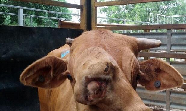【雙面牛驚現(xiàn)澳大利亞】澳大利亞媒體11日報道,澳昆士蘭北部地區(qū)一家出售了一條“雙臉!。根據(jù)社交媒體上的Po圖,這頭牛的第二張臉上有一只眼睛,倆鼻孔和一只牙齒。