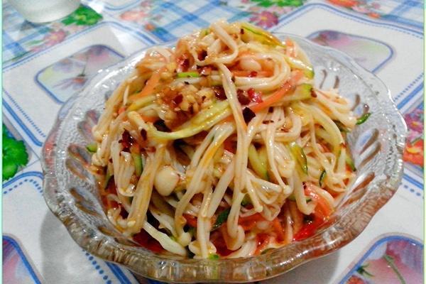 做法:金針菇撕開(kāi),凈水洗凈,青椒洗凈切絲,蒜剁成沫。洗凈后的金針菇放入開(kāi)水中汆燙,撈出,潷出水分;放入切好的青椒絲和蒜末,調(diào)入鹽、糖、芥末油和香油。 拌勻后,上桌前淋上紅油,即可。