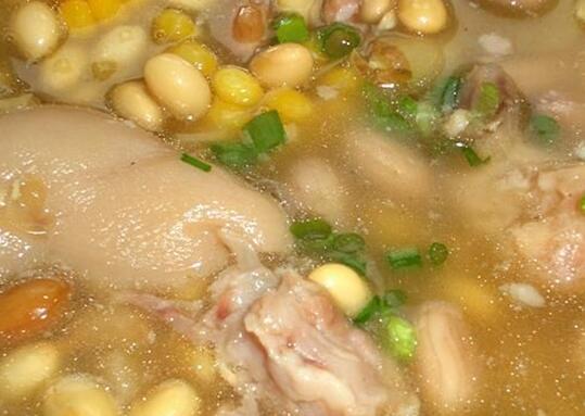 做法:豬腳加入姜片飛水去異味,切成小塊;加入去核切塊的雪梨、大豆和1塊姜,加足水煮到沸騰,開蓋繼續(xù)旺火沸煮15分鐘,轉(zhuǎn)慢火煲1小時,喝之前根據(jù)個人口味加鹽調(diào)味。