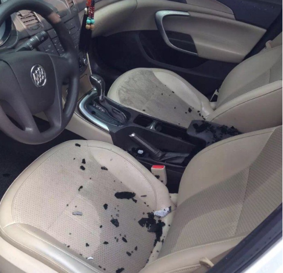 別克車內(nèi)也無一幸免,雨水透過窟窿流入了車內(nèi)的椅子上。