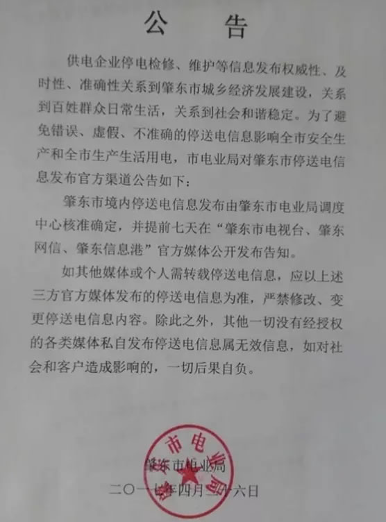 如其他媒體或個人需轉載停送電信息,應以上述三方官方媒體發(fā)布的停送電信息為準,嚴禁修改、變更停送電信息內容。除此之外,其他一切沒有經(jīng)授權的各類媒體私自發(fā)布停送電信息屬無效信息,如對社會和客戶造成影響的,一切后果自負。
