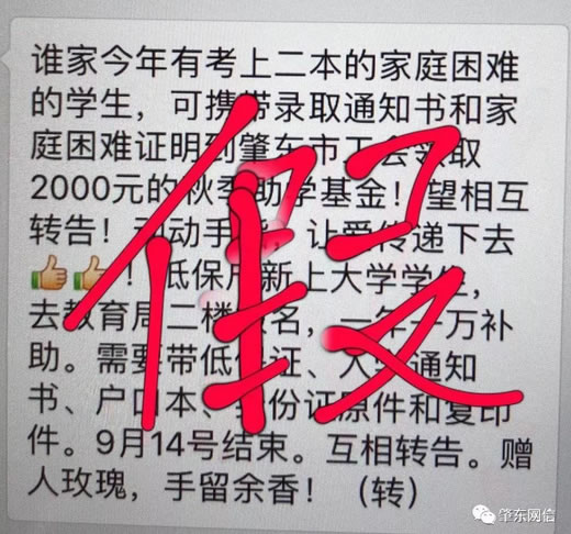 近日,一則內(nèi)容為“誰家今年有考上二本的家庭困難的學生,可攜帶錄取通知書和家庭困難證明到市工會領取2000元的秋季助學基金”的消息在微信朋友圈和群聊中頻頻傳播,并引發(fā)關注。