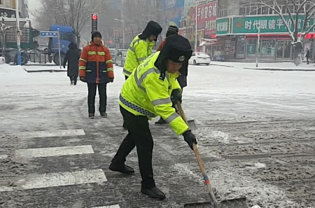 城區(qū),交警堅守崗位,加大指揮疏導力度,及時救助行人和受困車輛,維護正常道路交通秩序。在人民小學和肇東火車站,城鎮(zhèn)一中隊中隊長張曉偉帶領(lǐng)隊員,與環(huán)衛(wèi)部門一同清理道路積雪,方便車輛和行人通行。