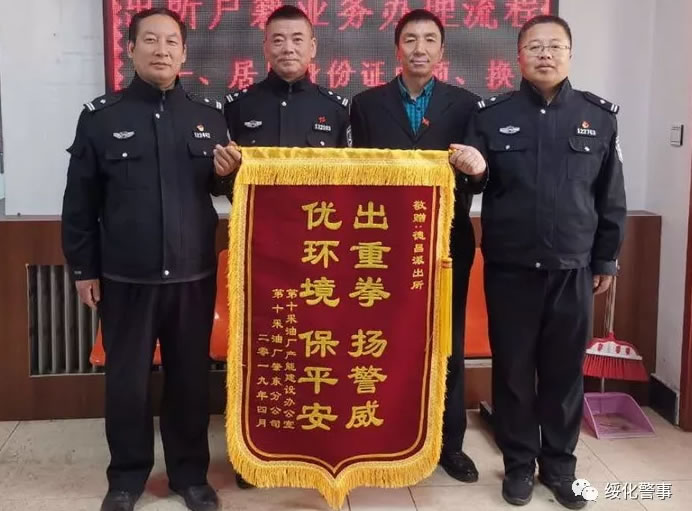 4月19日,大慶采油十廠生產(chǎn)運(yùn)行部相關(guān)領(lǐng)導(dǎo)到肇東市公安局德昌派出所,將寫有"出重拳,揚(yáng)警威,優(yōu)環(huán)境,保平安"的錦旗送給德昌派出所,感謝多年來對油田企業(yè)發(fā)展所做的努力。